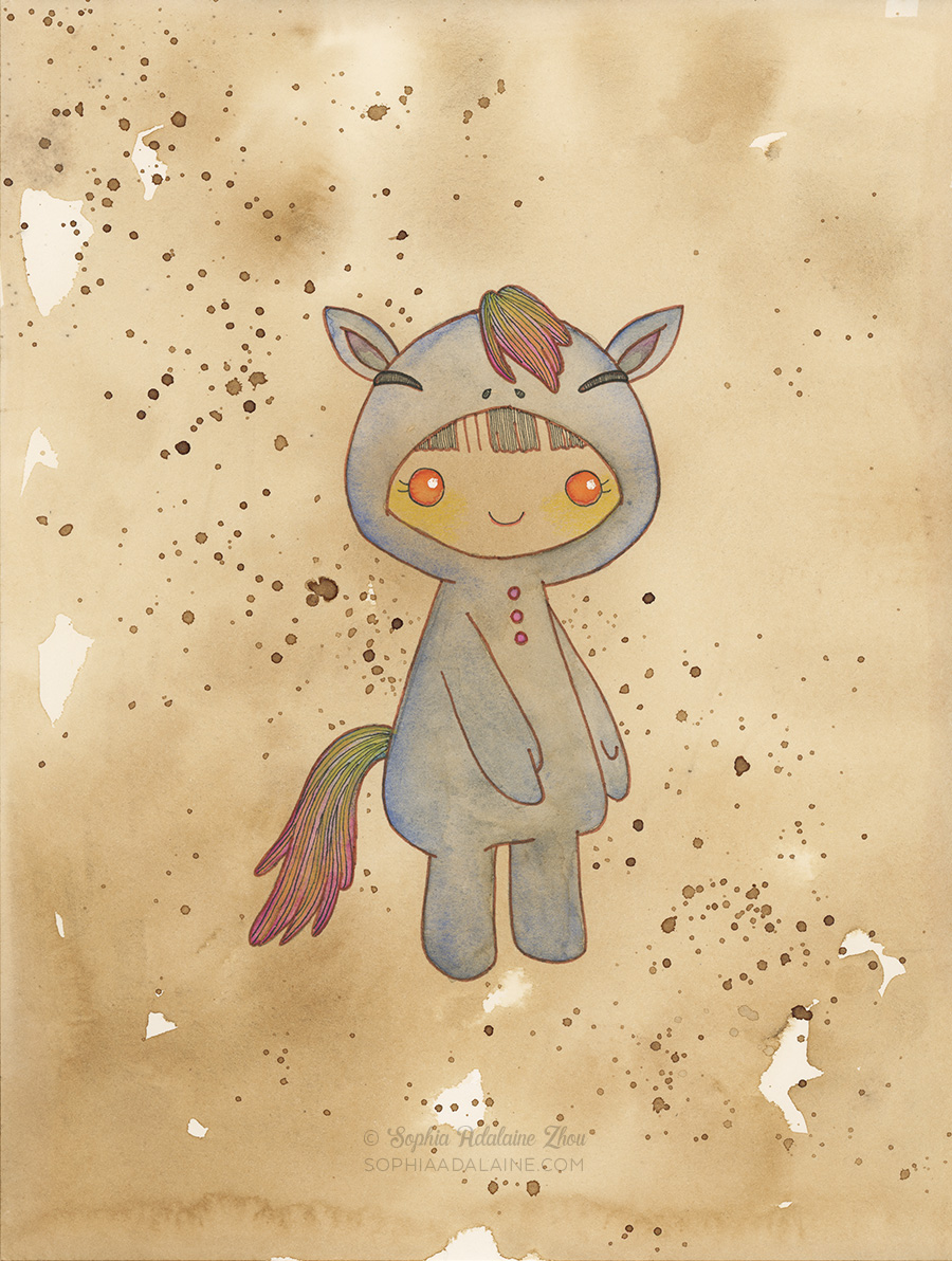 The original was made with archival ink pens, watercolor paint, acrylic paint, and homemade black walnut ink.