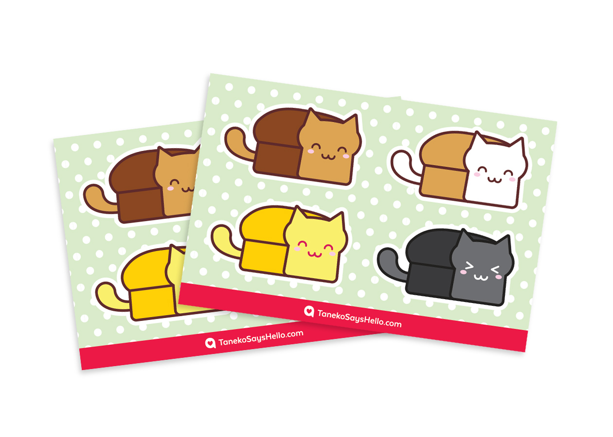 This sticker sheet has a matte vinyl finish, making it durable against water, sunlight, and scratches. It includes Meow-Bao's flavors of WheatLoaf, WhiteLoaf, SaffronLoaf, and BurntLoaf—all on one 4"x6" sticker sheet! Each loaf is kiss-cut for easy peeling and sticking :)