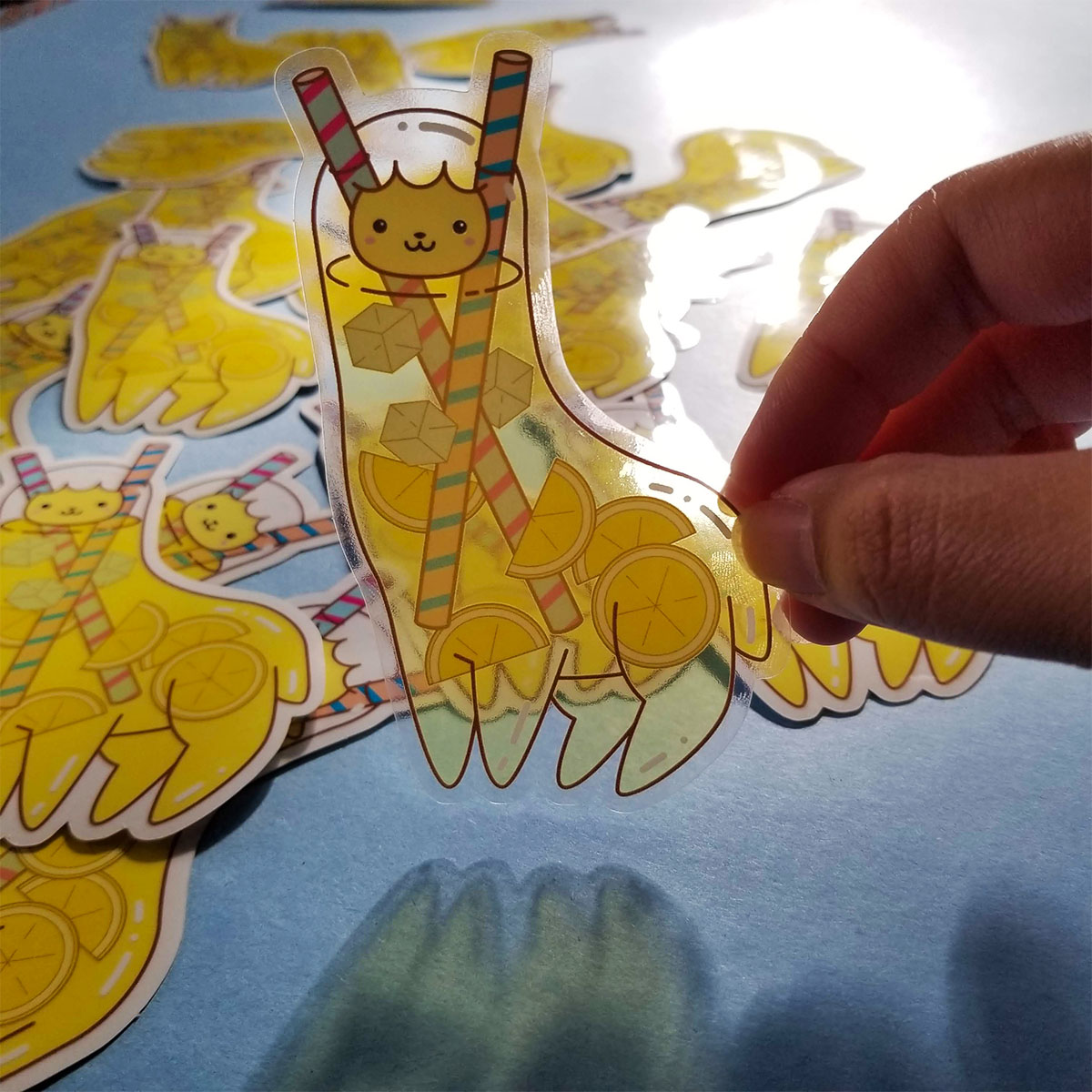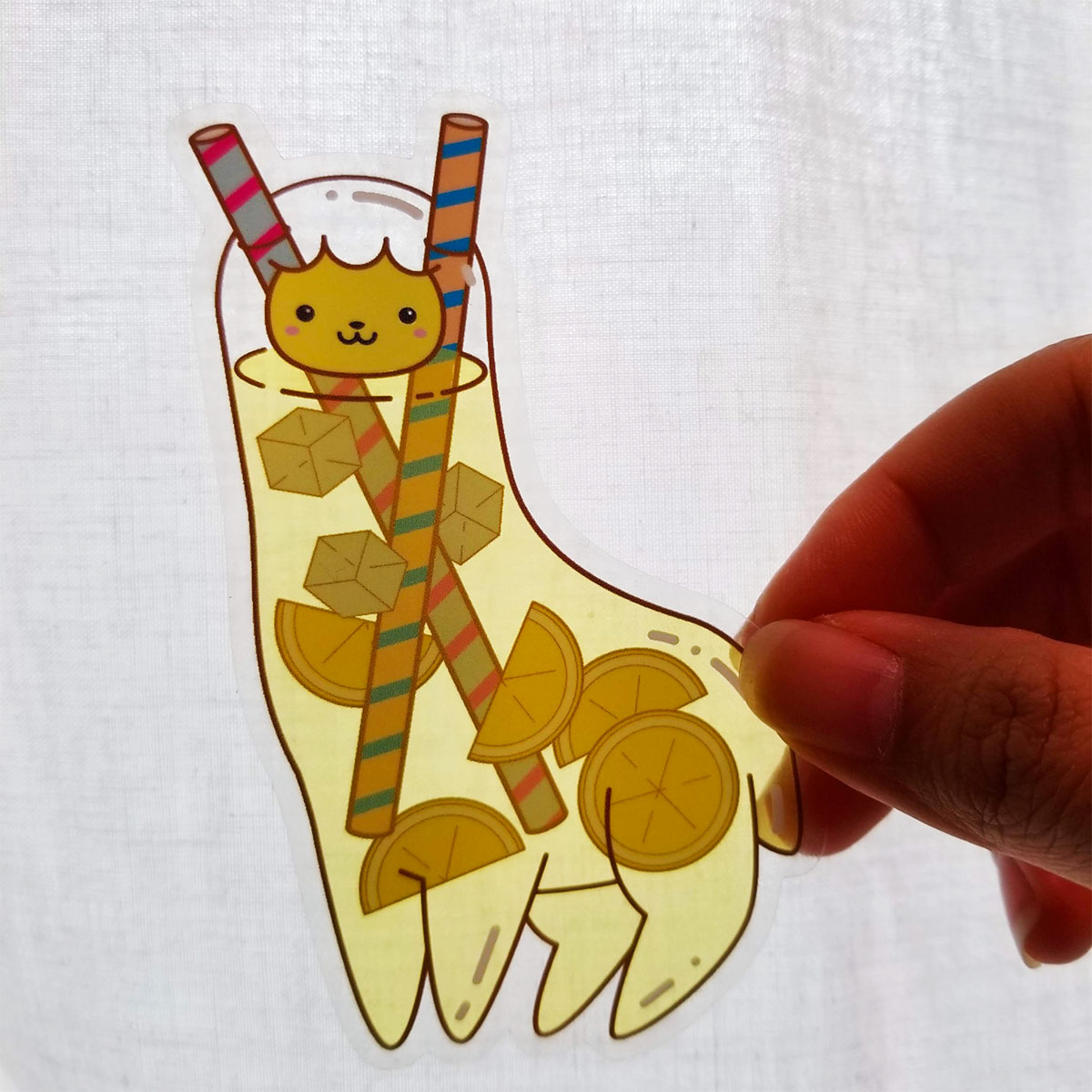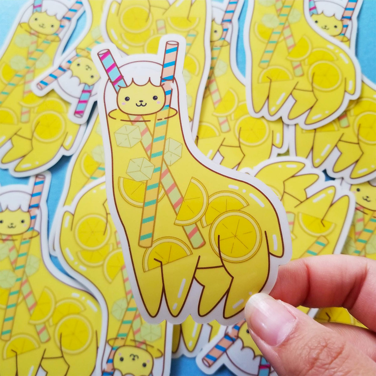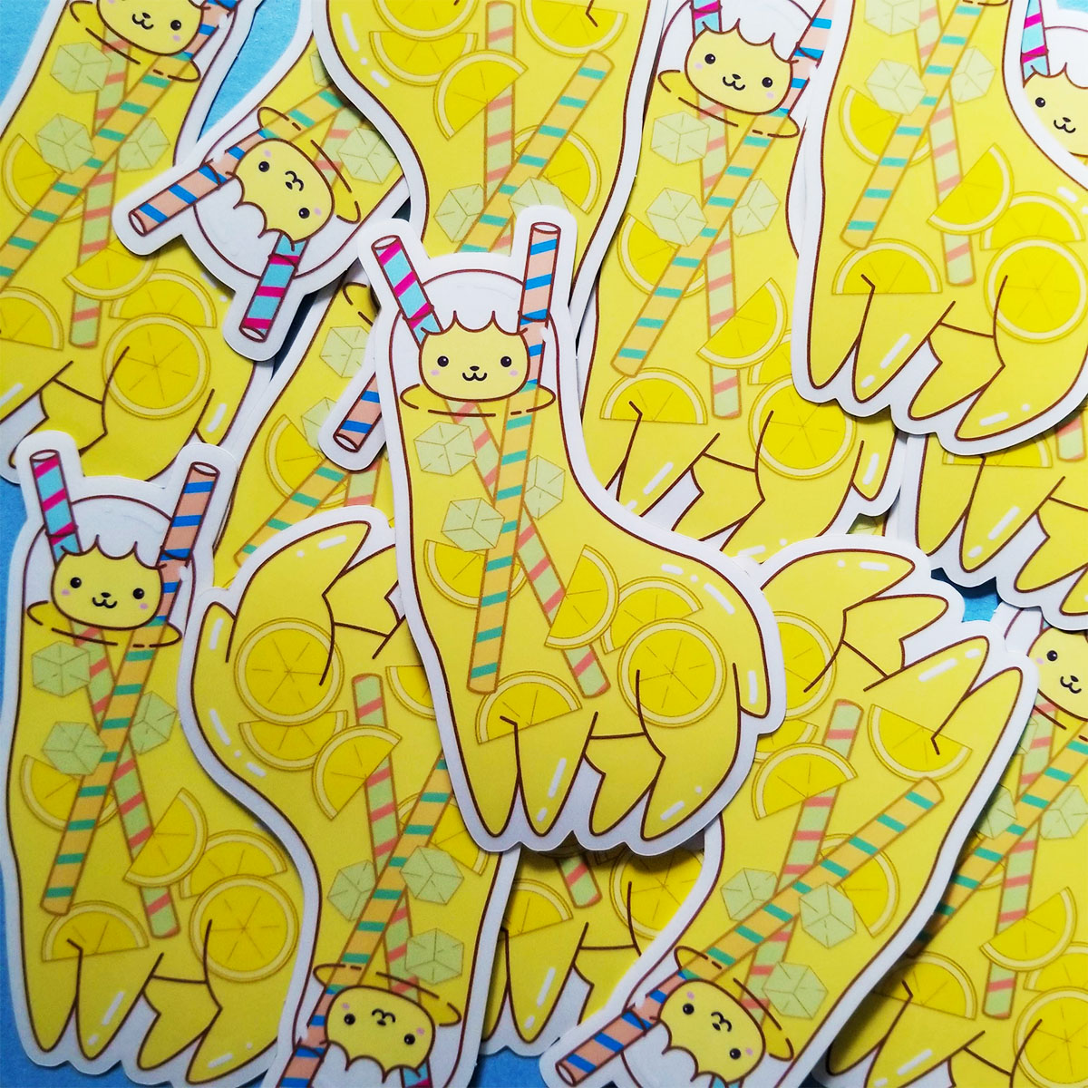 Like tall glasses of refreshing lemonade, these stickers are see-through! Each sticker is approximately 4"x3" and is laminated with UV screening to protect from sunlight and weather. The lemonade portion of the llama art is finished with translucent vinyl sticker material that is lightly yellow, like real lemonade!
