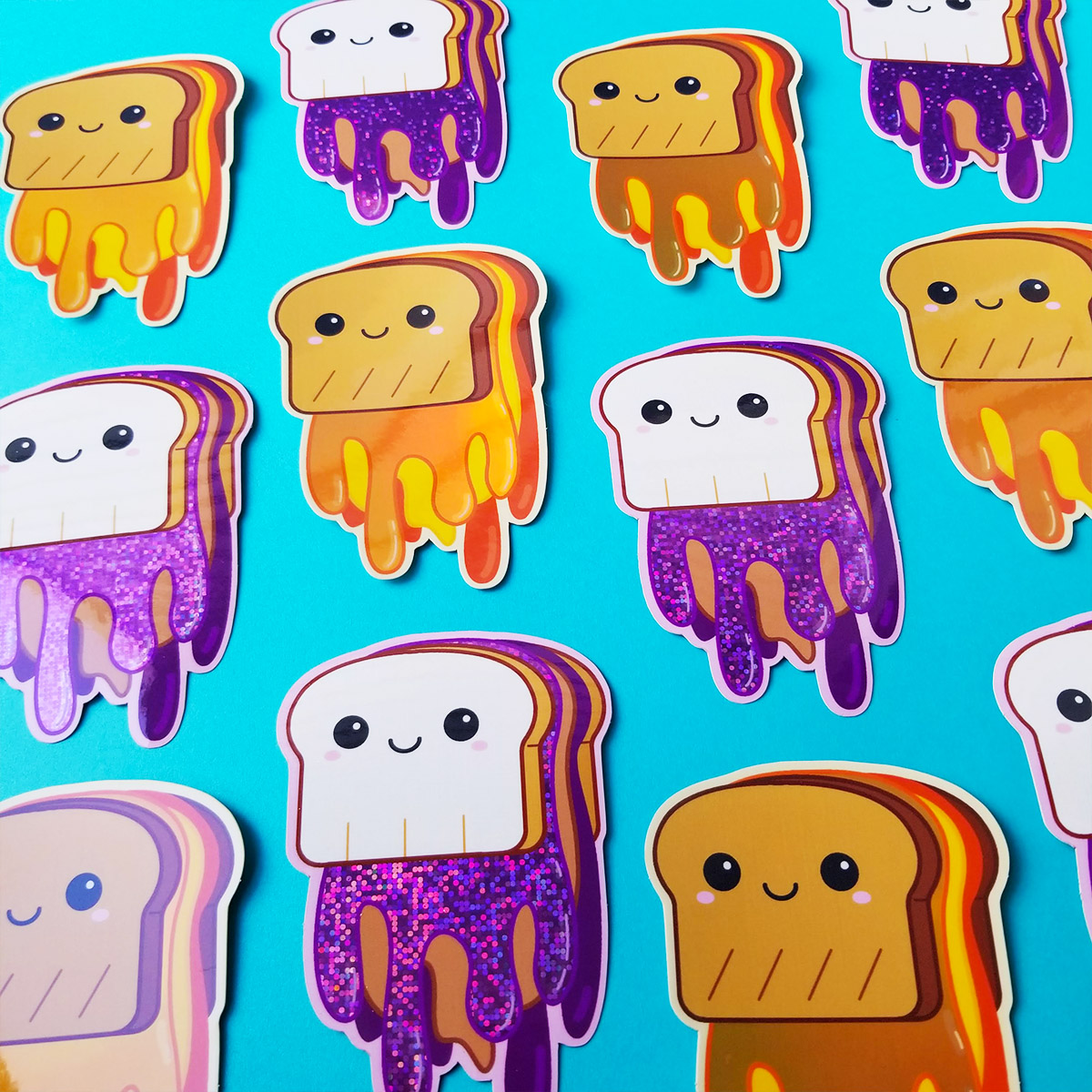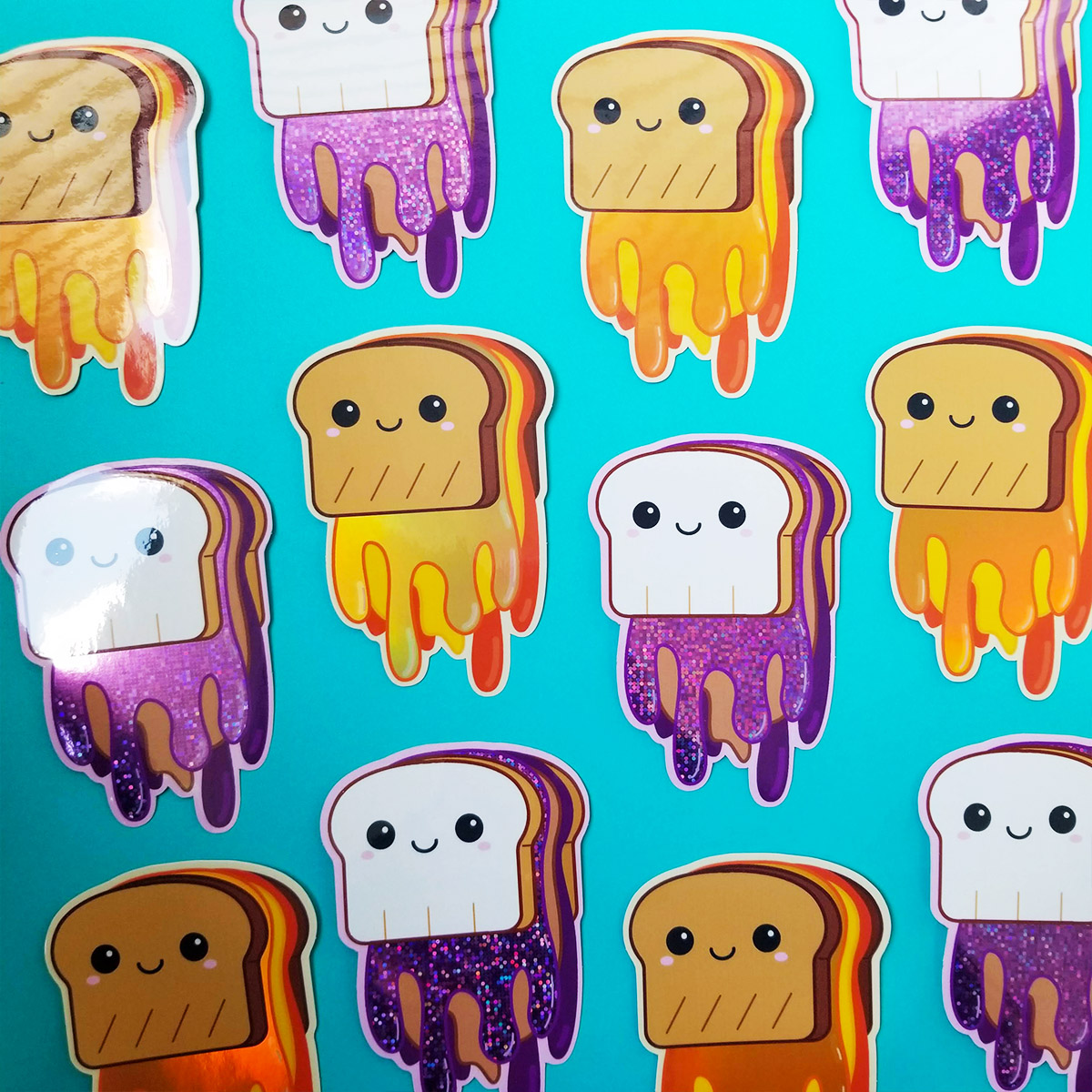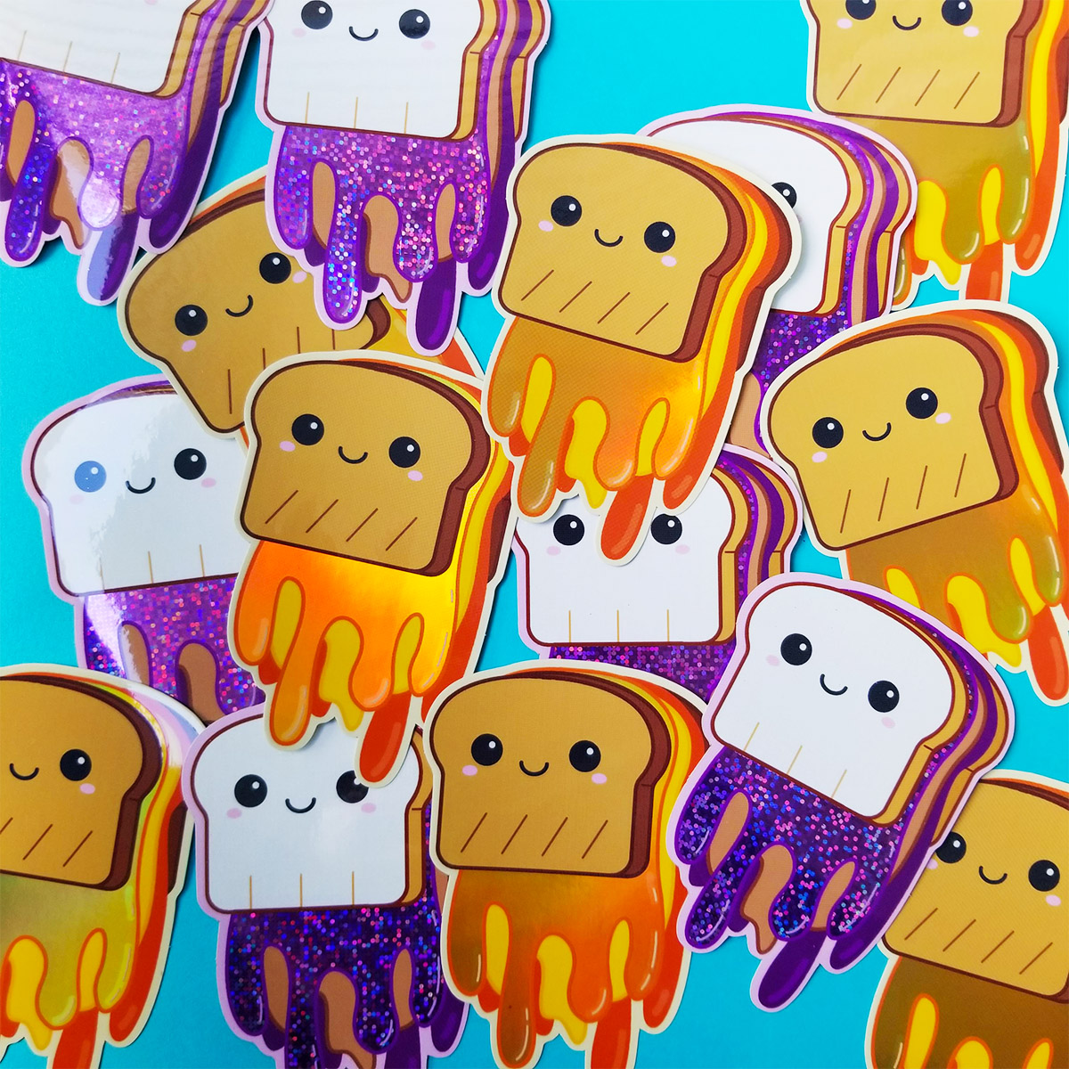 Each sticker is approximately 4"x3" and is laminated with UV screening to protect from sunlight and weather. Peanut-butter Jellyfish has glittery, holographic jelly, and Grilled Chez has shiny, holographic cheese~