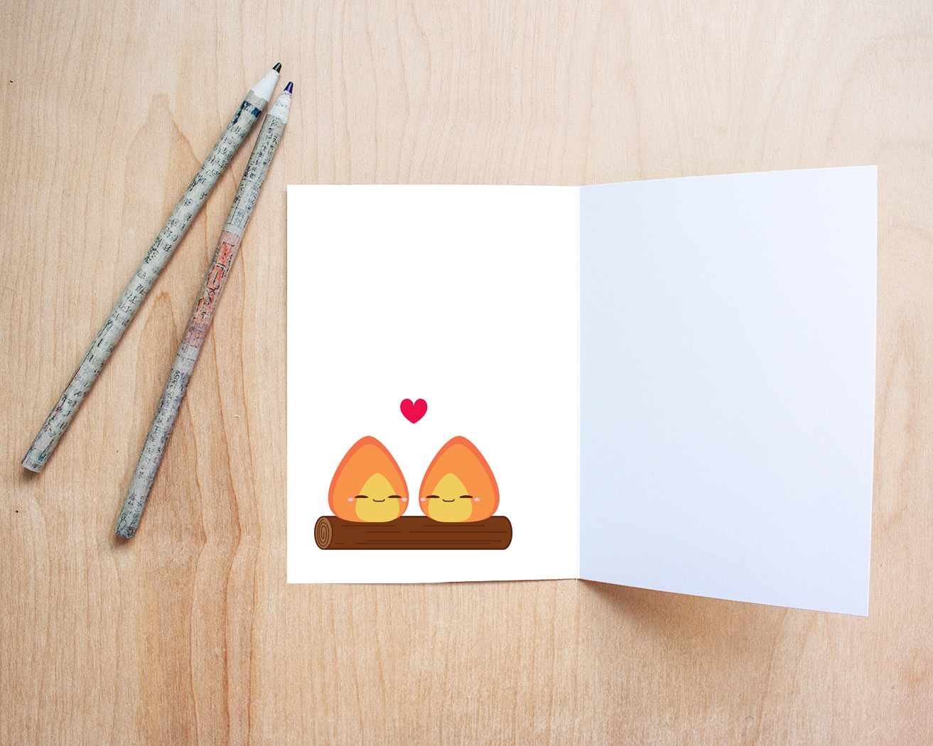 They are folded cards that are printed on premium, uncoated matte paper that gives them a smooth, soft texture finish. Each card has a blank side inside with a pair of cozy campfires on the left side, and comes with a crisp white envelope.